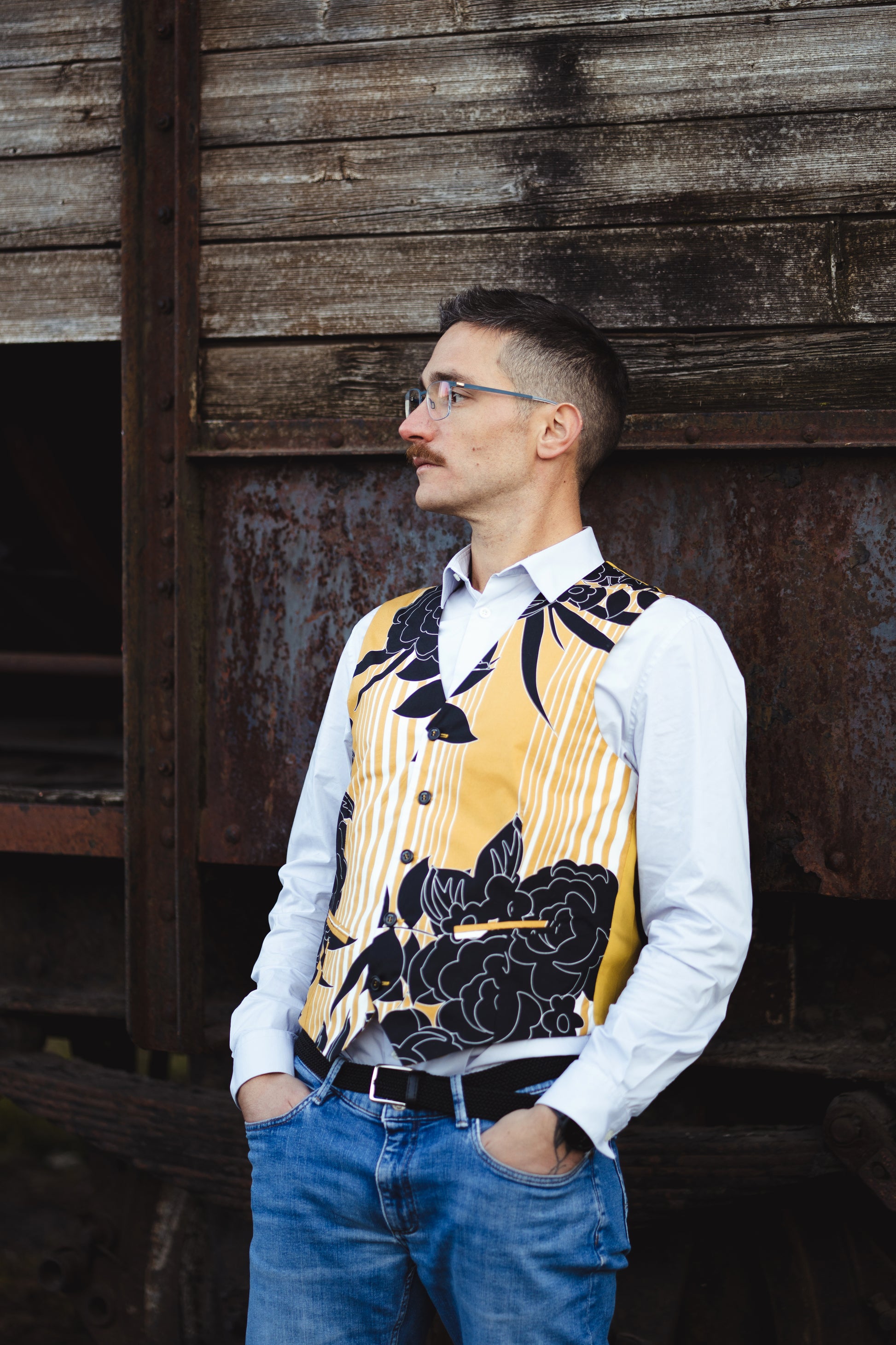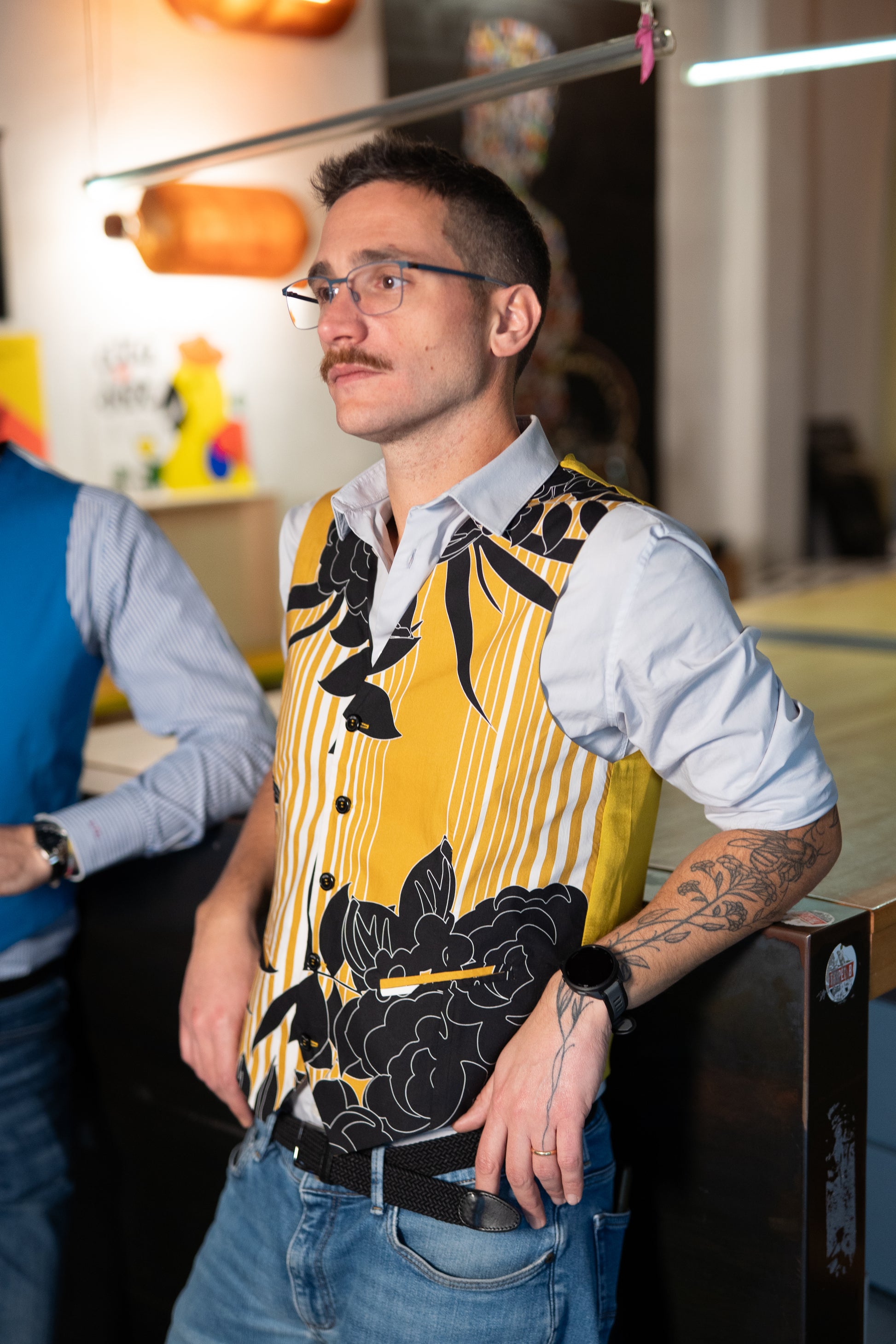 I gilet della collezione Flowers, sono realizzati in collaborazione con OMBRADIFOGLIA, e combinano tessuti di alta qualità con motivi floreali e geometrici.